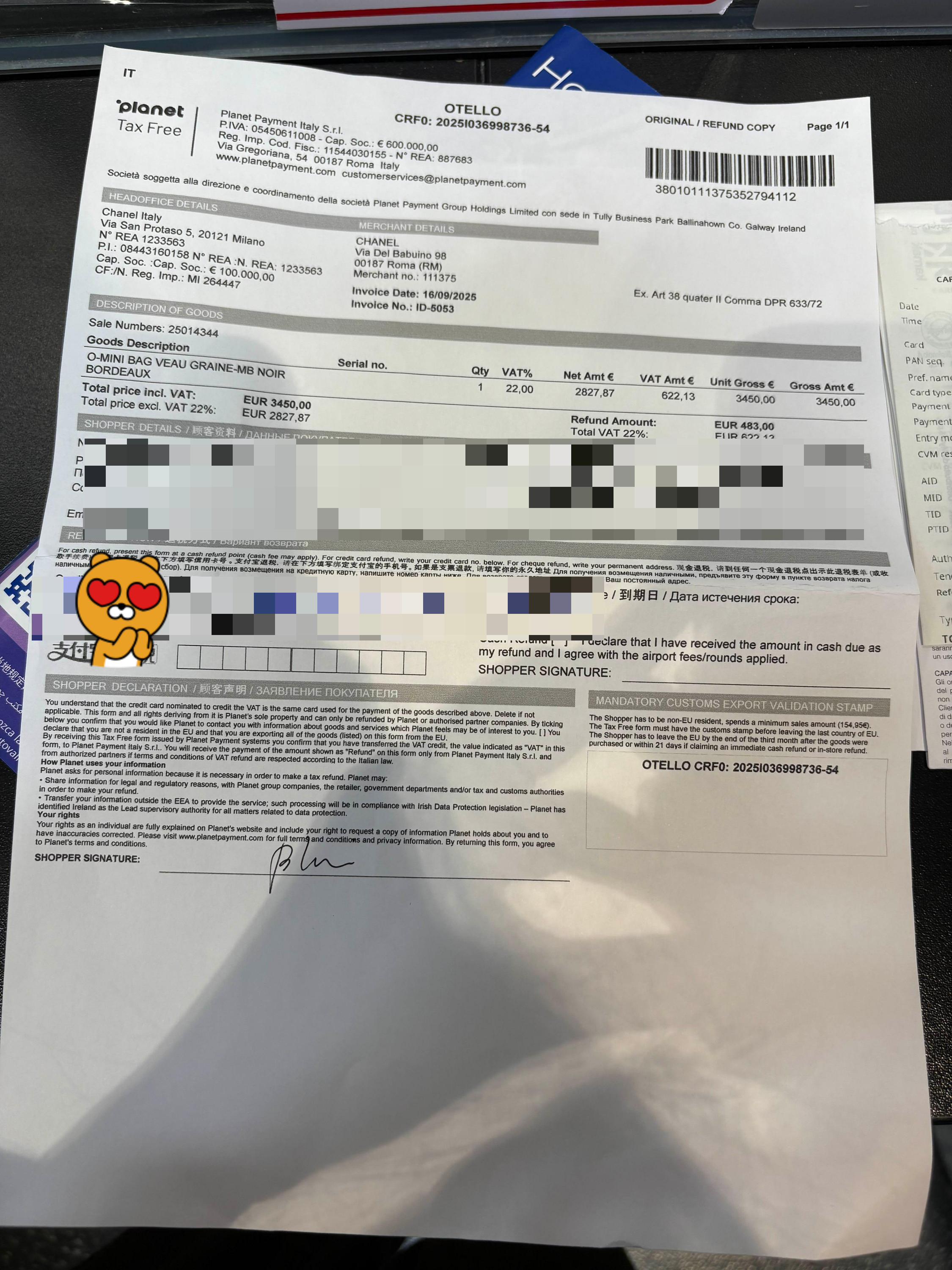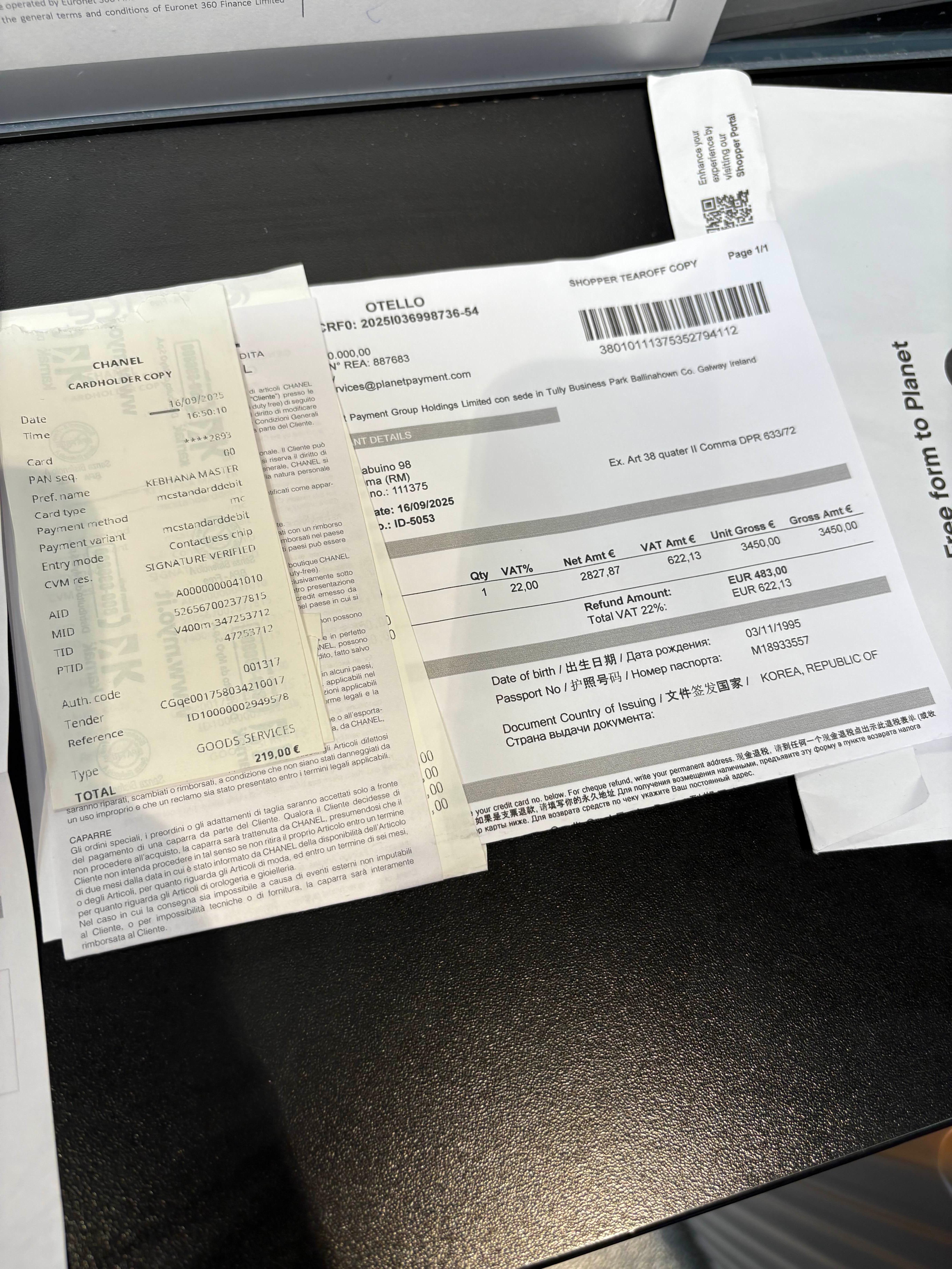 택스프리가 가능하다면, 계산할 때 “Tax Free, please!”라고 말해주세요. 서류 발급을 위해 여권 정보를 작성하면 가맹점에 따라 Global Blue 또는 Planet에서 서류를 발급해줍니다. (보통은 Global Blue가 많은데 샤넬은 Planet이더라고요)