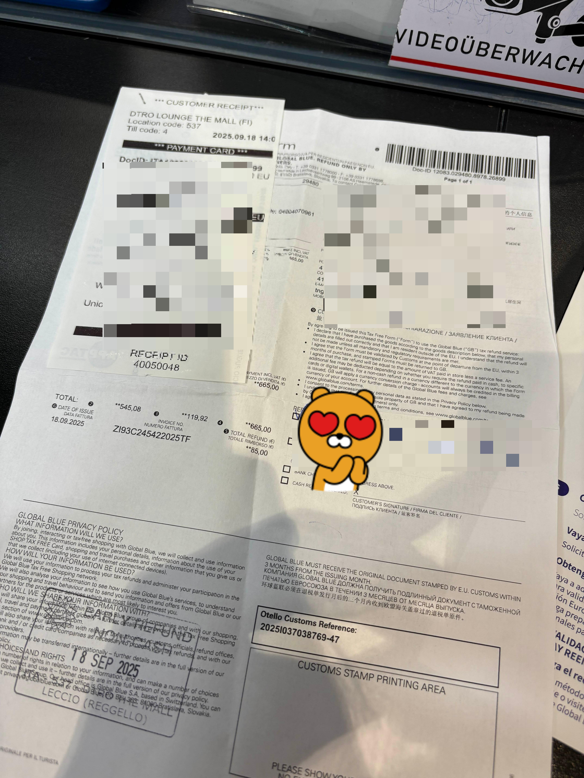 - 택스프리 서류에 환급받을 신용카드 번호를 써서 (체크카드 안됩니다. 꼭 신용카드여야해요)