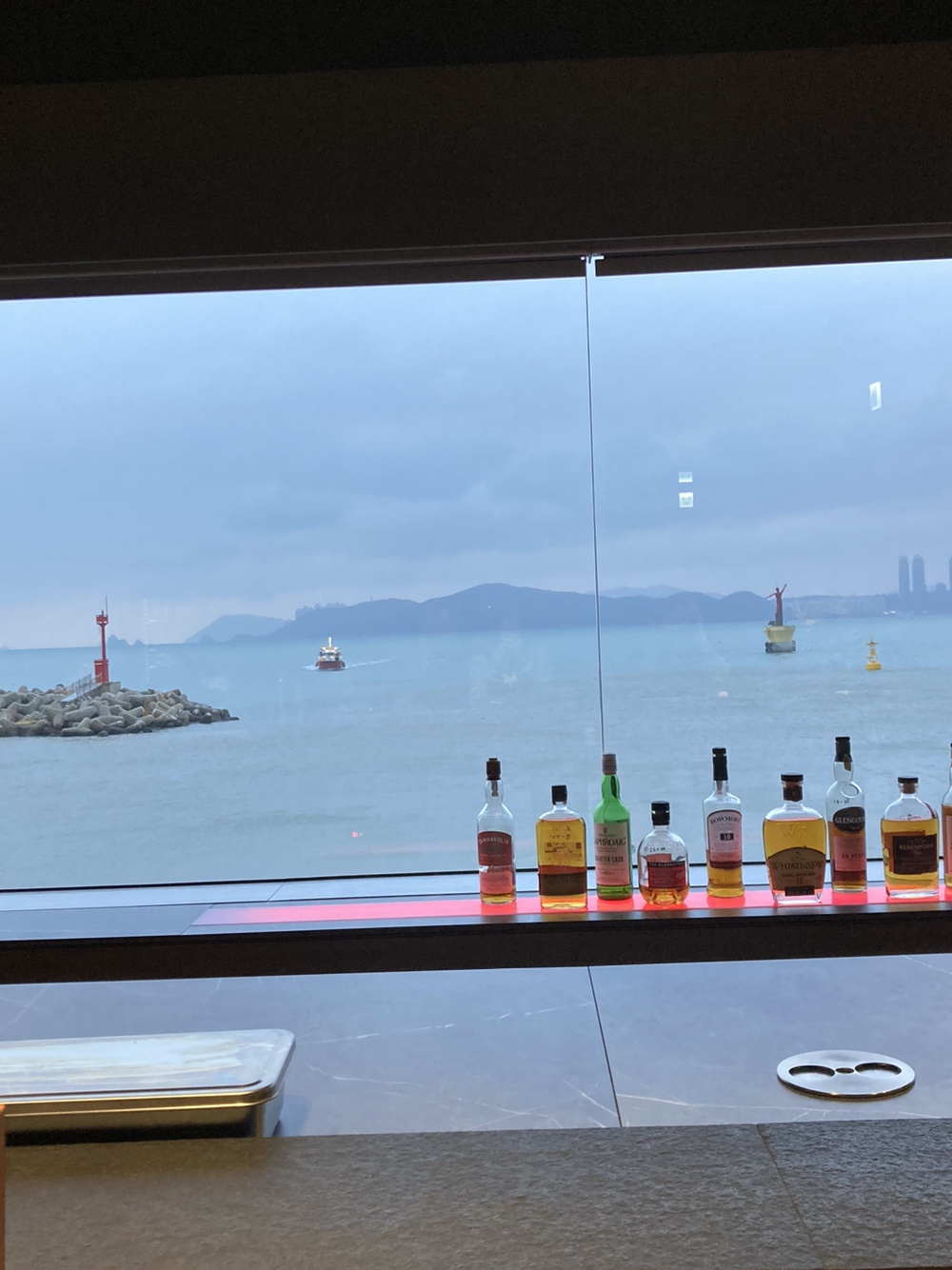 커튼이 올라가면서 해운대 바다 뷰가 보인다.