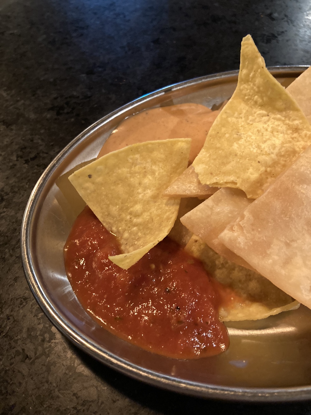나쵸 + 2가지 소스를 가득 퍼오면 된다.